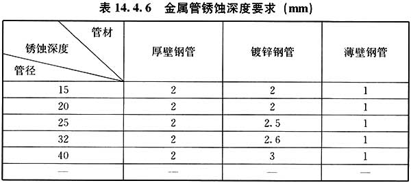 ????2??金屬管銹蝕、穿孔致導(dǎo)線裸露,或銹蝕深度大于表14.4.6的規(guī)定,或銹蝕長度大于100mm;