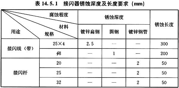 14.5.1??當(dāng)接閃器銹蝕深度或長度大于表14.5.1的規(guī)定時(shí),應(yīng)進(jìn)行拆換。