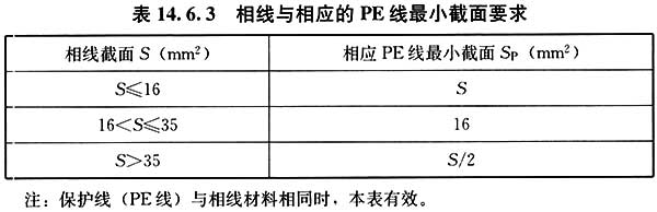 14.6.3??相線與相應(yīng)的PE線最小截面應(yīng)符合表14.6.3的要求,當(dāng)有機(jī)械保護(hù)時(shí),最小截面應(yīng)大于或等于2.5mm2;當(dāng)無機(jī)械保護(hù)時(shí),最小截面應(yīng)大于或等于4.0mm2。